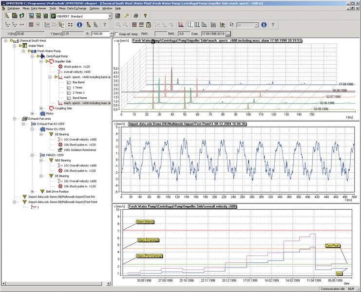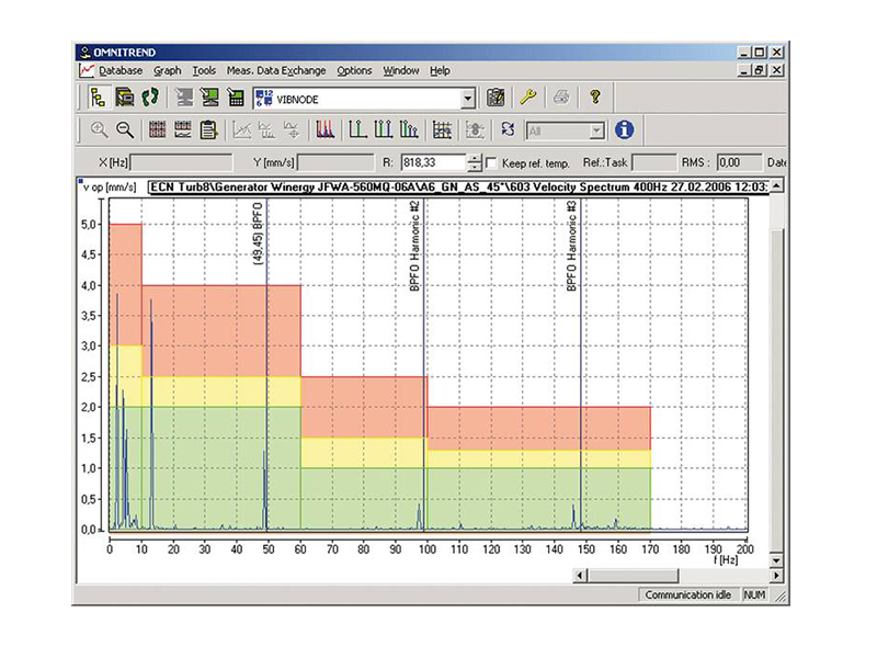 OMNITREND mapea las mediciones periódicas y le brinda herramientas de análisis eficientes y potentes. Tendencias de vibración global, lecturas de pulso de choque, espectros FFT, filtros envolventes y muchas otras modernas funciones ayudan a diagnosticar eficientemente problemas de maquinaria.